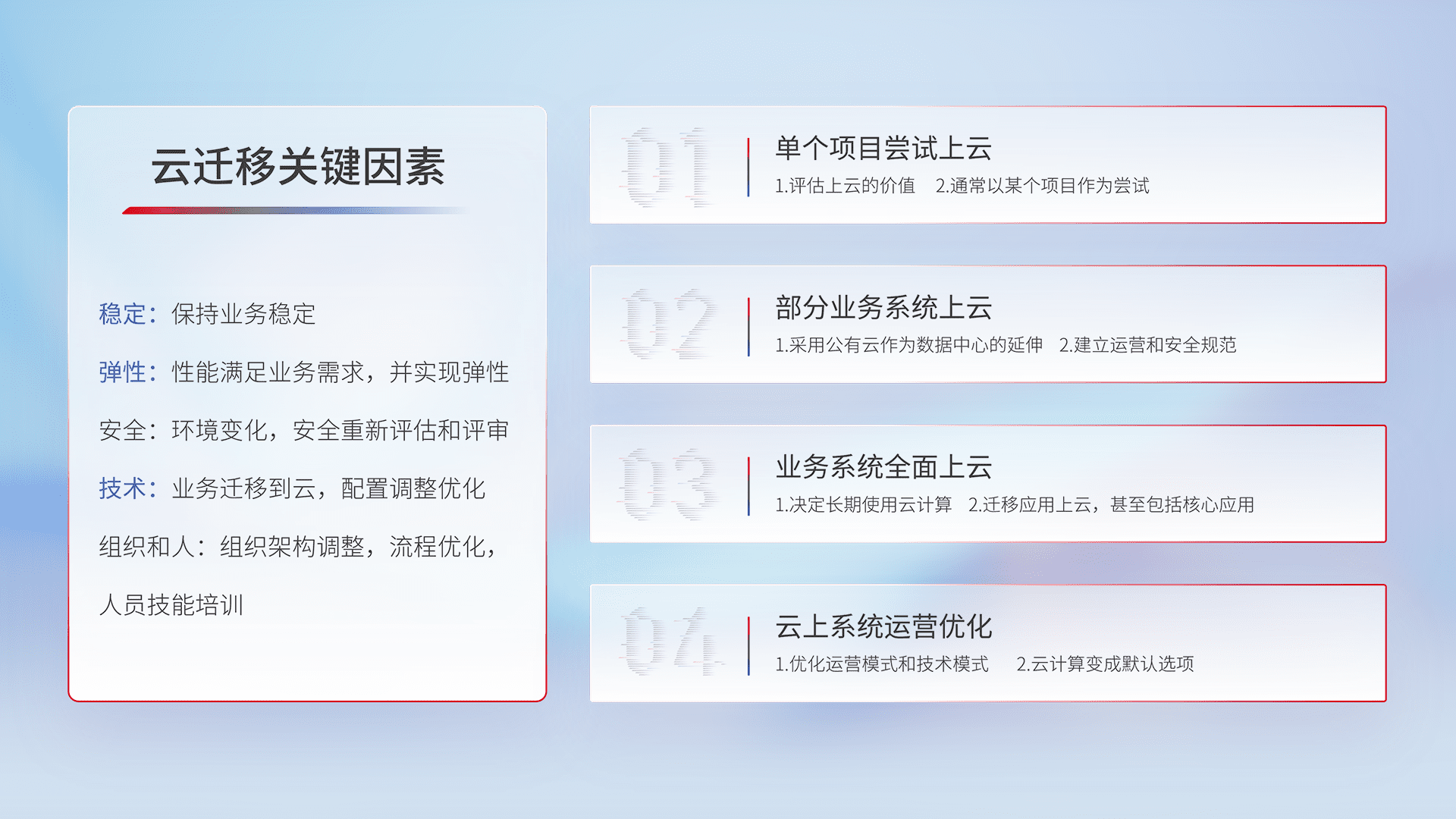 结合实际业务,,从规划设计、、、云平台选型、、、、云原生改造、、、数据迁移、、集成交付,,,迁移全过程为客户识别最佳上云路径,,,做好风险识别管理,,,设计网络架构、、身份权限、、、、安全审计合规、、、、操作审计、、、、日志审计、、、监控告警策略、、、、多站点容灾设计等,,对云上基础设施进行整体规划,,,,提升IT治理水平,,以满足弹性、、高可用、、、、高性能的需求。。。。